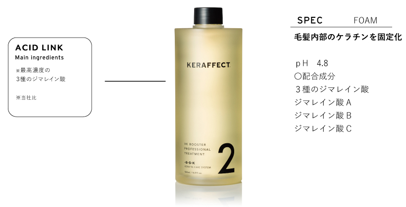 低分子から高分子まで複数種類の活性ケラチンを、3ステップに分けて髪内部へ浸透&定着。
