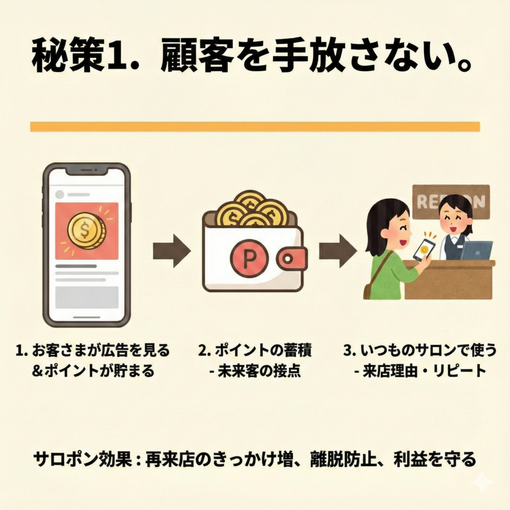 お客さまが広告を見る→ポイントが貯まる→そのポイントを“いつものサロンだけ”で使える仕組みです。