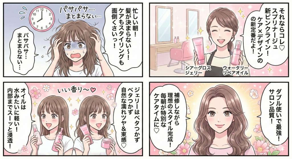 スプリナージュのシアーグロスジェリー&ウォータリーリペアオイルは、サロン現場の声から生まれた“使い心地も仕上がりも妥協しない”新時代のケアスタイリングアイテム。肌に触れても安心の処方と、思い通りの質感を叶える機能性で、毎日のスタイリング時間が特別なケアタイムになります。
