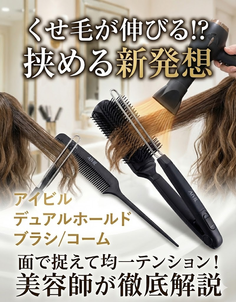アイビル デュアルホールド(ブラシ/コーム)は“ステンレスピンで髪を挟む”新発想。くせ毛のブローを面で捉えて均一テンションに。使い方・向く髪・デメリットまで美容師目線で解説。