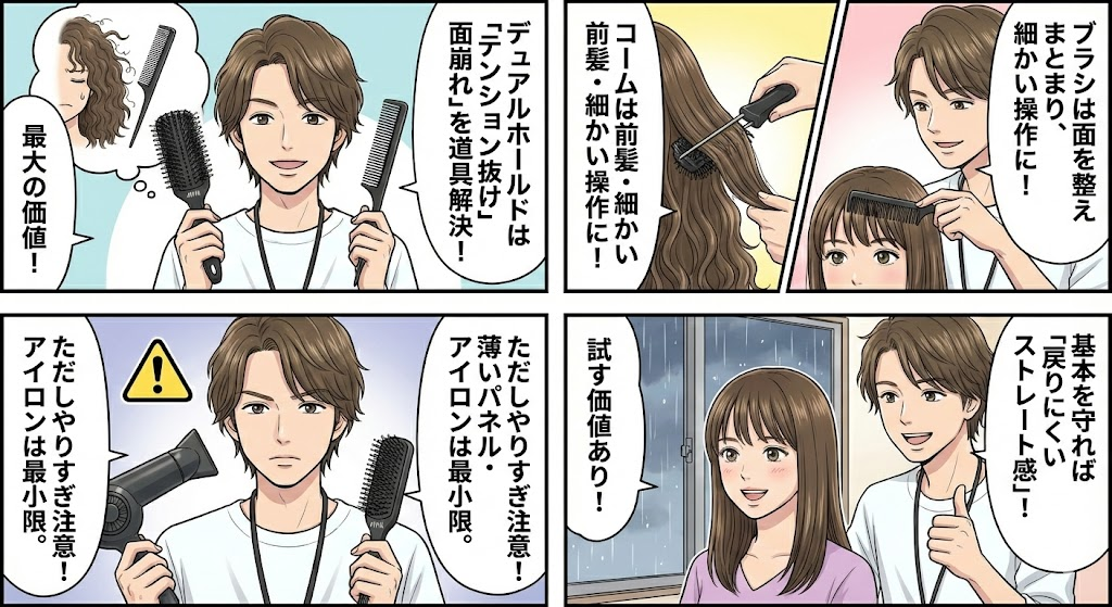 結論:ブラシは“面を作って伸ばす”、コームは“短い髪・細かい操作で伸ばす”が得意です。