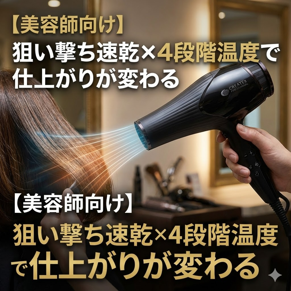 クレイツ「マイスタードライType-G」は、ただ速く乾かすドライヤーじゃなく、**狙った場所に風を当てて(エイムドライ)、60〜120℃の4段階温度で“仕上がりを設計できる”**プロ向けモデルです。根元は低温で形を作り、毛先は高温で一気に乾かして、最後にCOOLで固定——この乾かし分けだけで、ツヤ・まとまり・ボリュームの再現性が上がります。
