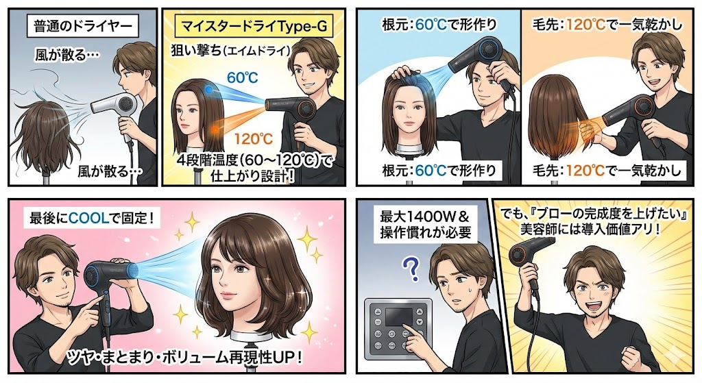 マイスタードライType-Gは「風の当て方がブレない=ブローの完成度が上がる」設計で、さらに60〜120℃の4段階温度で“乾かし方そのもの”を組み立てられるプロ向けドライヤーです。 速乾だけじゃなく、ツヤ・まとまり・ボリュームの狙いが立てやすいのが強み。