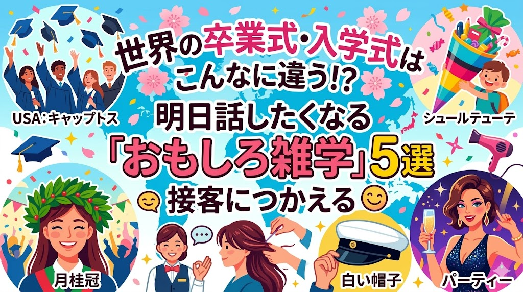 卒業・入学シーズン到来!アメリカの帽子投げ、ドイツの巨大なお菓子、イタリアの月桂冠など、世界のユニークな式典文化を美容師が紹介。日本との意外な違いや、式典で崩れないヘアスタイルの秘訣まで、接客で大人気の雑学をまとめました。