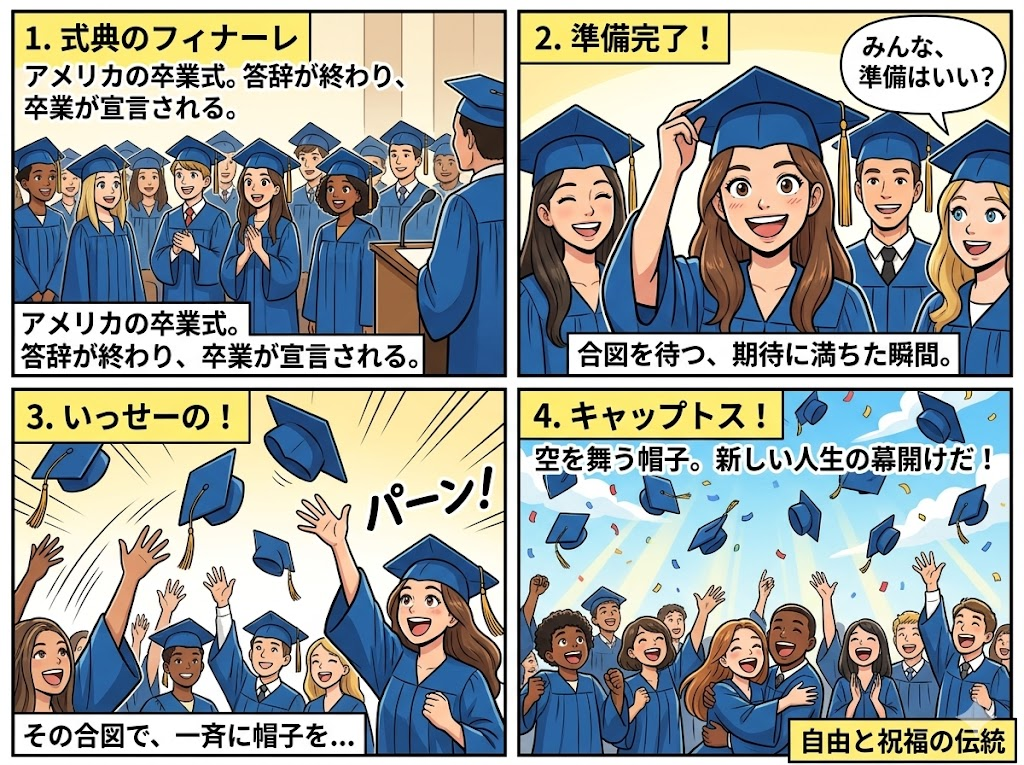 アメリカの卒業式のハイライトといえば、四角い帽子(モルターボード)を全員で一斉に投げる**「キャップトス」**です。