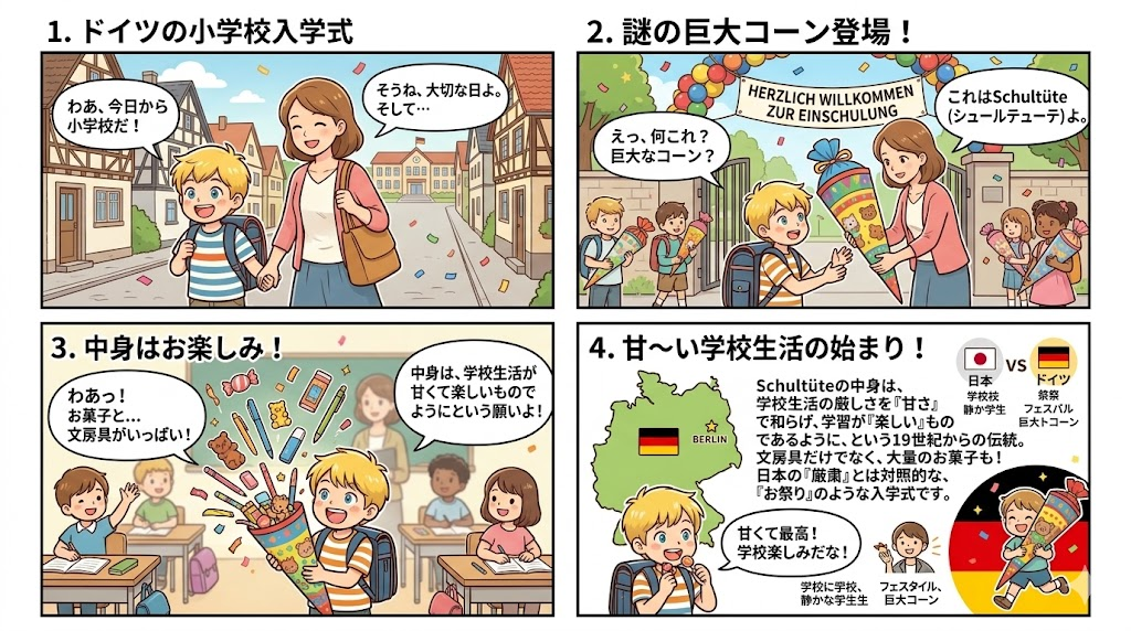ドイツの小学校入学式に欠かせないのが、身長ほどもある巨大な円錐形の包み**「Schultüte(シュールテューテ)」**です。