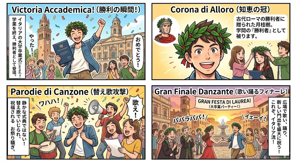 イタリアの大学卒業式(Laurea)では、卒業生は頭に**「月桂冠(リーフ)」**を載せて街を歩きます。
