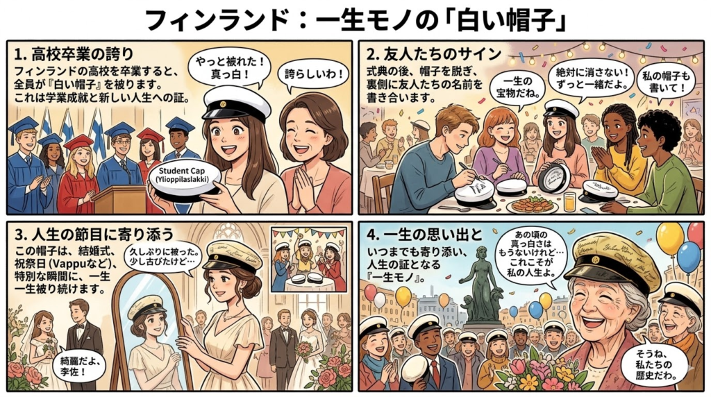 フィンランドの高校卒業式では、全員が**「白い帽子(Student cap)」**を被ります。